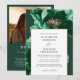 Cette élégante invitation de mariage floral vert émeraude et or peut être personnalisée avec vos informations en typographie moderne et les détails de votre mariage au verso, ainsi que le code QR de votre site web de mariage et une photo spéciale. Conçu par Thisisnotme©