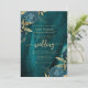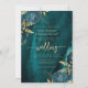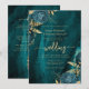 Cette élégante invitation de mariage présente des bouquets floraux bleus sarcelle mis en valeur avec de la verdure en faux feuilletage doré dans deux coins, sur une image de fond d'agate à l'aquarelle bleue sarcelle. Le texte personnalisable combine des polices sérif dorées, italiques et manuscrites. Le verso offre un espace pour les détails du mariage, ainsi qu'un code QR que les invités peuvent scanner pour visiter votre site web et répondre, ce qui permet d'économiser le coût d'impression et d'envoi de cartes de réponse séparées.