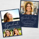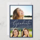 Une simple invitation à la fête de remise de diplômes en bleu avec un collage photo de 3 de la grade superposé avec "Graduate" dans un élégant script blanc, et leur nom, l'année de classe et l'école en lettres blanches modernes. Ajoutez une photo supplémentaire au dos et personnalisez les détails de votre fête.