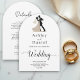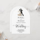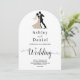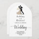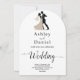 Cette élégante faire-part de mariage en arc noir et blanc est parfaite pour un mariage moderne. Le design simple présente une élégante calligraphie noire et une illustration de mariée et de mariée sur un arrière - plan blanc propre. La carte d'invitation comprend les détails du mariage au dos au lieu de payer une carte d'enceinte séparée.