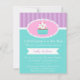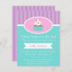 Un petit cupcake est en route ! Célébrez avec maman d'être d'une manière spéciale! Commencez par inviter les invités avec cette invitation au baby shower élégant, moderne et sucré! Il dispose d'un joli cupcake au gel crème blanc et décoré de minuscules garnitures de coeur. Il est placé dans un ovale avec des cercles plus colorés. Arrière - plan de motif à rayures violettes. Une palette de couleurs violet, rose, turquoise qui se démarque. Personnalisez facilement avec les détails de la fête baby shower.