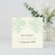 Annonce de save the date de mariage élégant damas motif vert menthe, marron, ivoire. Un design de mariage moderne mais classique avec une touche rétro. Délicat, avec la police élégante parisienne et une atmosphère vintage, parfait pour un mariage contemporain ou traditionnel de printemps ou d'été.