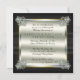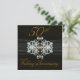 Fond noir en satin brillant raffiné et élégant pour un cinquantième anniversaire de mariage avec un ruban en satin noir orné de diamants dans un style à claustra qui se poursuit au dos. Le dos présente un faux carton argenté, doré et irisé monté dans les coins avec des fermoirs en diamant. Création originale de Holiday Hearts Designs (tous droits réservés).