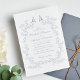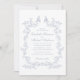 Elégante invitation de mariage avec un cadre d'aquarelle vintage orné composé de fleurs délicates de chinoiserie bleu poussiéreux et de feuilles avec deux tourterelles en haut. Les noms de la mariée et du marié sont dans un script bleu poussiéreux et les détails mariage sont en simple lettrage bleu poussiéreux. Parfait pour les couples qui embrassent l'esthétique populaire des petits-millénaires, mêlant romantisme d'une époque révolue avec une touche rafraîchissante et contemporaine.