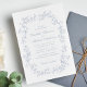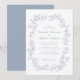 Elégante invitation de mariage avec un cadre d'aquarelle vintage orné composé de fleurs et de feuilles de style chinoiserie bleu poussiéreux. Les noms de la mariée et du marié sont dans un script bleu poussiéreux et les détails mariage sont en simple lettrage bleu poussiéreux. Parfait pour les couples qui embrassent l'esthétique populaire des petits-millénaires, mêlant romantisme d'une époque révolue avec une touche rafraîchissante et contemporaine.