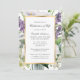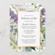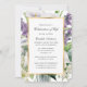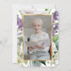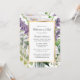 Elégante floraison blanche et or de l'invitation à la vie avec cadre doré orné de fleurs violettes, lys calla blanc, orchidées et verdure. Un cadre photo fleuri à l'arrière.