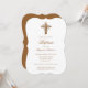 Elégante invitation au baptême d'or avec une croix florale d'or. Personnalisez facilement cette invitation minimaliste en ligne.