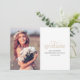 Ce joli carte photo de graduation présente une typographie élégante et un design minimaliste. Une photo verticale est affichée sur la gauche, avec le mot "Graduate" sur la droite, écrit en or élégant et décoré d'un tourbillon délicat. Le nom, l'école et l'année de diplôme du diplômé sont écrits en gris charbon ci-dessous, contre un arrière - plan blanc. Au fond, il y a un modèle pour les détails de la fête de remise des diplômes.