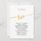 Ces élégantes cartes de table en or numéro 2 sont parfaites pour un mariage simple. Le design neutre présente une carte minimaliste décorée avec une typographie romantique et fantaisiste de feuille d'or. La carte s'imprime à l'avant et à l'arrière (double face).