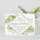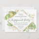 Cette élégante invitation à la fête tropicale présente un feuillage vert exotique aux accents dorés. Un cadre doré géométrique moderne met en évidence le texte vert foncé. Les plaquettes d'or accentuent le design botanique et apporte un peu de fantaisie sophistiquée à l'invitation. Cet invitation d'oasis insulaire est parfait pour toute soirée tropicale ou de fiançailles de jardin.