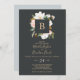 Cet élégant faire-part de mariage en monogramme noir et blanc magnolia est parfait pour un mariage moderne et classe. Le design floral moody est composé de pivoines roses d'aquarelle, de magnifiques fleurs de magnolia blanches et de coton avec de l'or et des feuilles verts dans un agencement luxueux sur un arrière - plan sombre. Personnalisez la carte avec votre dernier monogramme initial.