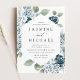 Élégantes invitations de mariage florales avec vos détails mariages entouré d'un cadre géométrique avec des roses bleu et blanc poussiéreux, des hydrangées, des feuilles d'eucalyptus luxuriants et de verdure. Ce faire-part de mariage floral bleu poussiéreux conviendra parfaitement à votre mariage de printemps ou d'été !