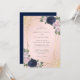 Elégante faire-part de mariage bleu marine et rousse avec cadre géo orné de fleurs bleues et rousses et de confettis dorés. Éléments correspondants disponibles.