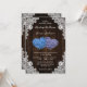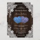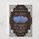 Elégant faire-part de mariage rustique violet et bleu fleuri avec deux coeurs fleuris sur un arrière - plan en bois de grange décoré de dentelle blanche fleurie. Éléments correspondants disponibles.