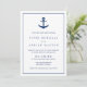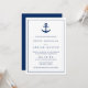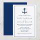 Invitations de mariage nautique avec un design simple et moderne avec une ancre bleu marine et les détails de votre événement à l'intérieur d'une frontière, sur un arrière - plan blanc. Ces élégants invitations sont parfaits pour un mariage d'été à thème côtier au bord de la plage.