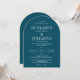 Elégante faire-part de mariage en arc avec un arrière - plan turquoise et des lettres blanches. Conception uniquement textuelle avec un libellé traditionnel. Options de papier imprimé numérique ou physique. Personnalisez-le avec les noms de M. et Mme, l'emplacement du lieu, le registre, les informations RSVP et tous les détails que vous devez inclure. Produits de suite correspondants disponibles.