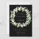 Une invitation de mariage hivernale avec des neiges peintes à la main et des tiges d'eucalyptus arrangées en une belle couronne contre un arrière - plan noir. Tout le texte est entièrement modifiable pour vous permettre de modifier facilement le libellé ainsi que le style/la couleur/la taille de la police. L'arrière comporte une diffusion optionnelle de points. Veuillez consulter cette collection dans mon magasin pour les invitations avec des options de libellé alternatives, des couleurs différentes et pour la coordination des articles.