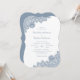 Invitations de mariage bleu poussiéreux simples, mais élégantes, avec dentelle florale bleu poussiéreux et une police de caractères élégante. Personnalisez facilement ces cartes de mariage bleu poussiéreux vintages avec vos détails de mariage.