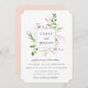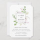 Cadre carré botanique fleur sauvage élégant, faire-part de mariage. Feuilles botaniques et branches vertes délicats et aérés avec des fleurs sauvages mauves et roses. Le dos de la carte est de couleur rose pétale solide.