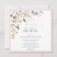 Invitation de mariage moderne et élégante de forme carrée, avec un bouquet floral de roses aquarelles douces dans des nuances de rose blush, pêche et blanc, avec des feuilles botaniques luxuriantes dans des nuances d'amour et d'eucalyptus, et bordées de rose. Personnalisez vos détails de mariage dans un noir doux accentué d'une belle calligraphie manuscrite moderne. Le dos de la carte présente une belle texture aquarelle rose. Copyright Elegant Invites, tous droits réservés.