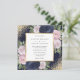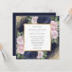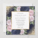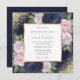 Elégante faire-part de mariage florale bleu marine et blush avec des roses bleues et roses rousses encadrant les détails mariages à l'intérieur d'un cadre doré orné de parties scintillant dorée./confetti.
