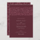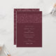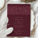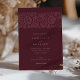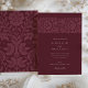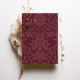 Cette élégante invitation de mariage présente un profond arrière - plan bordeaux, orné de motifs floraux complexes dans des tons assortis, créant une esthétique sophistiquée et intemporelle. L'avant de l'invitation présente un motif floral magnifiquement détaillé sur le dessus, associé à une typographie élégante qui présente gracieusement les détails mariages. Le dos poursuit le thème floral avec des initiales personnalisées, offrant un design harmonieux et homogène dans tout le bâtiment. Parfait pour les couples à la recherche d'un look moderne mais classique, la palette de couleurs riche et luxueuse de cette invitation ajoute une touche d'élégance royale, ce qui en fait l'idéal pour les mariages formels et romantiques.