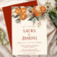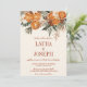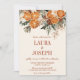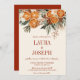 Cette élégante faire-part de mariage florale d'agrumes d'ivoire présente une végétation fleurie d'automne et d'hiver. Oranges en orange brûlée avec bâtons de cannelle et fleurs de couleur d'automne. Tout le texte, y compris les noms, peut être modifié. L'arrière - plan orange brûlé foncé au dos est facultatif.