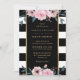 Elégante invitation à mariage rose aquarelle avec fleurs roses sur un arrière - plan rayé noir et blanc. Éléments correspondants disponibles. Personnalisez facilement ces cartes de mariage floral noir et blanc avec vos détails mariages.