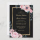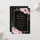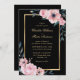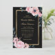 Elégante faire-part de mariage rose et noir avec cadre doré orné de fleurs rose vif et de verdure contre un arrière - plan noir. Éléments correspondants disponibles. Personnalisez facilement cette carte mariage aquarelle avec vos détails mariages.