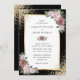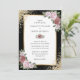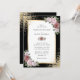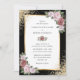 Invitation vos invités à votre mariage noir et roux avec ces élégantes invitations à mariage florales avec des fleurs roses et de la verdure encadrant les détails mariages à l'intérieur d'un cadre doré orné de confettis dorés. Éléments correspondants disponibles.
