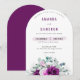 Cette élégante invitation au mariage présente une forme d'arc moderne et un design floral rustique. Fleurs violettes profondes, roses rousses et blanches avec verdure créent une atmosphère romantique et un peu vintage. Le texte est propre et simple, mettant l'accent sur les noms du couple et les détails du mariage. Cette invitation conviendra parfaitement aux couples à la recherche d'élégance classique et de charme naturel et rustique.