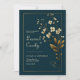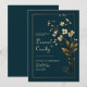 Donnez le ton d'un luxe discret pour votre jour spécial avec ce design botanique sophistiqué. Le fond profond et velouté de la marine minuit agit comme une toile de fond dramatique pour une illustration dorée scintillante dans le coin. Une grande fleur stylisée aux pétales rayonnants est entourée de délicates grappes de bourgeons et de feuilles, le tout rendu dans une riche texture métallique dorée qui capte la lumière. Une bordure dorée propre et minimaliste encadre la composition, ajoutant une touche finale de polissage moderne. Ce design capture un sentiment de romance intemporelle et de style haut de gamme. C'est une invitation de mariage parfaite pour les cérémonies officielles du soir, les galas élégants en smoking ou une célébration moderne chic.