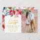 Élégantes invitations de mariage avec un fond blanc classique, une photo des mariés, un décor floral aquarelle, un titre typographique en faux or élégant et un modèle de mariage moderne.