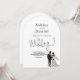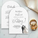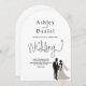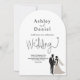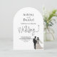 Cette élégante faire-part de mariage en arc noir et blanc est parfaite pour un mariage moderne. Le design simple présente une élégante calligraphie noire et une illustration de mariée et de mariée sur un arrière - plan blanc propre. La carte d'invitation comprend les détails du mariage au dos au lieu de payer une carte d'enceinte séparée.
