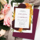 Cette élégante invitation à un mariage présente un design d'aquarelle époustouflant avec des marigots bordeaux et oranges dorées vibrantes. Un cadre en or surprenant entoure le texte, imprimé dans une police de caractères bordeaux sophistiquée, ajoutant à l'atmosphère luxueuse. La carte d'invitation est bordée d'un orchestre bordeaux foncé sur la gauche, complétant l'oeuvre d'art florale. Le design, intitulé "MARIGOLD", évoque un sentiment de romantisme et de chaleur, ce qui le rend parfait pour une fête mariage d'automne ou de soirée. La disposition simple et élégante fournit toutes les informations essentielles clairement tout en maintenant une esthétique haut de gamme.