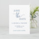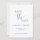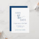 Cette simple carte minimaliste de sauvegarde à jour est parfaite pour annoncer votre prochain mariage. Cette carte présente un design bleu et blanc marine avec un texte élégant. Customisez le texte à l'avant et à l'arrière de la carte avec tous les détails de votre journée spéciale. #savethedate #notre mariage #minimalistmariage