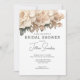 An Elegant Modern Taupe and Black Bridal Shower Invitation designed with soft watercolor florals and gold colored text on a black background. The front text includes: Bridal Shower, the Bride's Name, Date, Time, Location, Address, and Hosted By. The reverse side includes the text: RSVP details, on a soft taupe colored background. To personalize, simply insert all your details into our easy template, replacing the sample text.