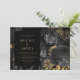 Cette faire-part de mariage élégante et moody présente un design floral luxuriant et romantique en noir avec un feuillage en faux parties scintillant doré. Customisez le texte de couleur or dans des polices stylisées sur un rectangle noir. Le dos de la carte est noir.