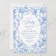 Create a timeless first impression with this baby shower invitation featuring elegant French toile de jouy roses in refined shades of navy blue, royal blue, dusty blue, and deep blue, inspired by classic chinoiserie floral design. This sophisticated style blends heritage elegance with modern charm, making it perfect for a memorable baby shower celebration.
