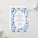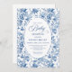 Create a timeless first impression with this baby shower invitation featuring elegant French toile de jouy roses in refined shades of navy blue, royal blue, dusty blue, and deep blue, inspired by classic chinoiserie floral design. This sophisticated style blends heritage elegance with modern charm, making it perfect for a memorable baby shower celebration.