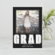 Cette offre sophistiquée GRAD Class de 2025 présente un élégant thème noir et blanc. Le mot "GRAD" est affiché en caractères gras et blancs, ce qui crée un contraste frappant avec l'arrière - plan noir. L'avant de l'invitation présente la photo du diplômé, ajoutant une touche personnelle au design. À l'arrière de l'invitation, une photo supplémentaire et un grand espace vous permettent d'inclure votre propre texte, ce qui en fait une invitation vraiment personnalisable et mémorable pour l'occasion spéciale.