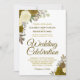 Cette faire-part de mariage fleurie présente une belle aquarelle peinte à la main avec des roses dorées et jaunes entourées de sprigs d'eucalyptus, de feuillage et de verdure. Le libellé est formel et comprend des lettres de script sophistiquées. La carte a un dos doré marbré avec un petit bouquet des mêmes fleurs.