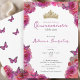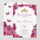 This elegant pink floral quinceanera invitation has magenta roses, a gold crown, and pink butterflies with a personalizable template to create your own invites. The invitation template is customizable in the listing editor and is also available as a digital download that's printable after you personalize it.
