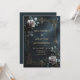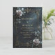 This design blends the delicate beauty of nature with a sophisticated, moody atmosphere. Set against a deep, textured charcoal background, two realistic pale pink roses bloom in opposite corners, accompanied by shimmering metallic silver leaves and slender, graceful stems. A thin, ornate rectangular frame in a dark bronze finish features intricate scrollwork and elegant filigree, providing a majestic and structured focal point for your details. The contrast between the soft floral tones and the dark, textured backdrop creates a sense of timeless romance and regal mystery. As a wedding invitation, this piece is an exquisite choice for a formal evening ceremony, a romantic winter wedding, or a gothic-themed gala. It offers a unique and polished first impression, promising guests an event filled with grace and dramatic elegance. This striking botanical imagery works beautifully for any refined social gathering or high-end branding project.
