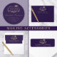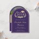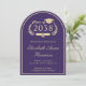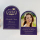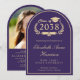 Invitation officielle en forme d'arc violet de la fête de graduation de l'université avec "Classe de" dans une illustration dorée d'une couronne de laurier, un casquette et diplôme de grade d'or, et le nom du diplômé dans un élégant script d'or. Ajoutez leur école, major, distinctions honorifiques ou plans d'avenir dans la typographie classique de la serif d'or. Au verso, ajoutez votre photo et les détails de la fête.