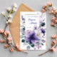 Invite your guests with breathtaking elegance using this sophisticated floral wedding invitation. The design showcases a stunning, painterly watercolor bouquet arranged gracefully around a central frame, set against a crisp white background. Gorgeous, large flowers in rich shades of deep purple, violet, and soft lavender provide dramatic focal points, beautifully contrasted by crisp white anemones and delicate smaller purple blossoms. This exquisite arrangement is artfully interwoven with dusty blue-green eucalyptus leaves, creating a fresh, romantic, and sophisticated feel. A minimalist, thin gold rectangular frame provides a perfect, elegant space for your event details. Perfect for sophisticated spring, summer, or elegant evening weddings, this design is also ideal for enchanting bridal showers, milestone birthday celebrations, anniversary parties, or upscale garden events. This versatile design can also be adapted for sophisticated corporate galas, charity fundraisers, or elegant announcements requiring a touch of refined floral beauty.