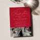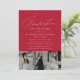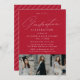 Invités Invitations pour célébrer la grade avec nos élégants invitations de la fête de remise de diplômes photo! Le design comprend un script de calligraphie moderne avec les détails de votre fête de remise des diplômes affichés en lettres blanches contre un arrière - plan rouge. Les invitations uniques de la fête de remise de diplômes présentent trois photos en ligne au bas de la conception. L'invitation de graduation multi-photo s'inverse pour afficher un motif simple en diagonale rouge et blanc.