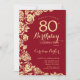 Invitation à la fête de 80e anniversaire de l'or rouge floral. Design élégant avec des roses, fausse feuille d'or et police de script de typographie. Carte invitation tendance parfaite pour une célébration anniversaire élégante. Peut être customisé à n'importe quel âge. Invitations Zazzle imprimées ou téléchargement instantané modèle imprimable numérique.