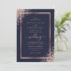 Elégant faire-part de mariage bleu marine et or rose avec une police de caractères de script moderne. Personnalisez facilement cette carte mariage élégante avec vos détails mariages à l'intérieur d'un cadre doré rose orné de parties scintillant/confettis en or rose.