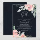 Cet élégant floral rose vif est une invitation à baby shower fille est parfait pour un baby shower simple ou saupoudrer. Le design est composé de roses rose vif dessinés à la main et de pivoines avec des feuilles verts et gris dans un arrière - plan bleu foncé, inspirant beauté naturelle.